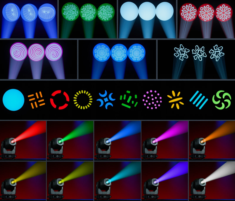 - Гобо: 2 колеса гобо: 9+1 статичных гобо, 6+1 вращающихся гобо