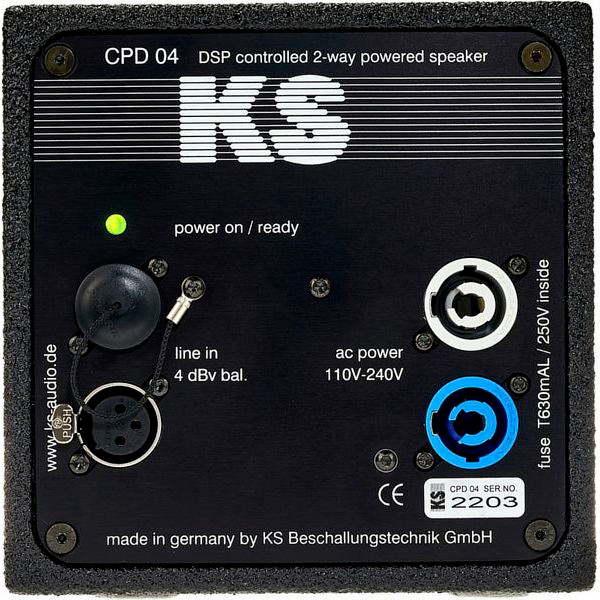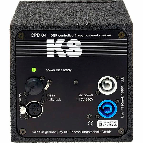 KS-AUDIO CPD 04 – малогабаритная лёгкая 2-полосная полнодиапазонная активная акустическая система с интегрированными усилителями класса D (Bi-Amp), предназначенная, кроме самостоятельного использования, для дополнения звуковых комплектов объёмного звучания. Возможно использование в составе комплектов трансляционного оборудования для музыкально-речевого вещания. Отличается высоким качеством звука, особенно на пиковых режимах, за счёт, в том числе, применения компрессора с дополнительной защитой громкоговорителей от повреждения. Высококачественный НЧ/СЧ динамик с диафрагмой из высокопрочного углеродного волокна. Электронно симметричные коммутационные разъёмы. Прочный корпус выполнен из стали с полиуретановым покрытием. Две точки закрепления М6. Опционально: U-образная рама для монтажа.